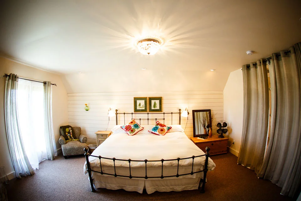 Get a treat or cup of brew from the selection in the kitchenette where you can peek upwards into the cupola and discover the warm green glow radiating from an antique turkish wine flask. Walk through massive reclaimed french doors, collapse onto an ultra comfortable king bed and take in the view of a ledgestone fireplace with flames among river rock. Above fireplace, open an ancient barn door revealing large HD television.